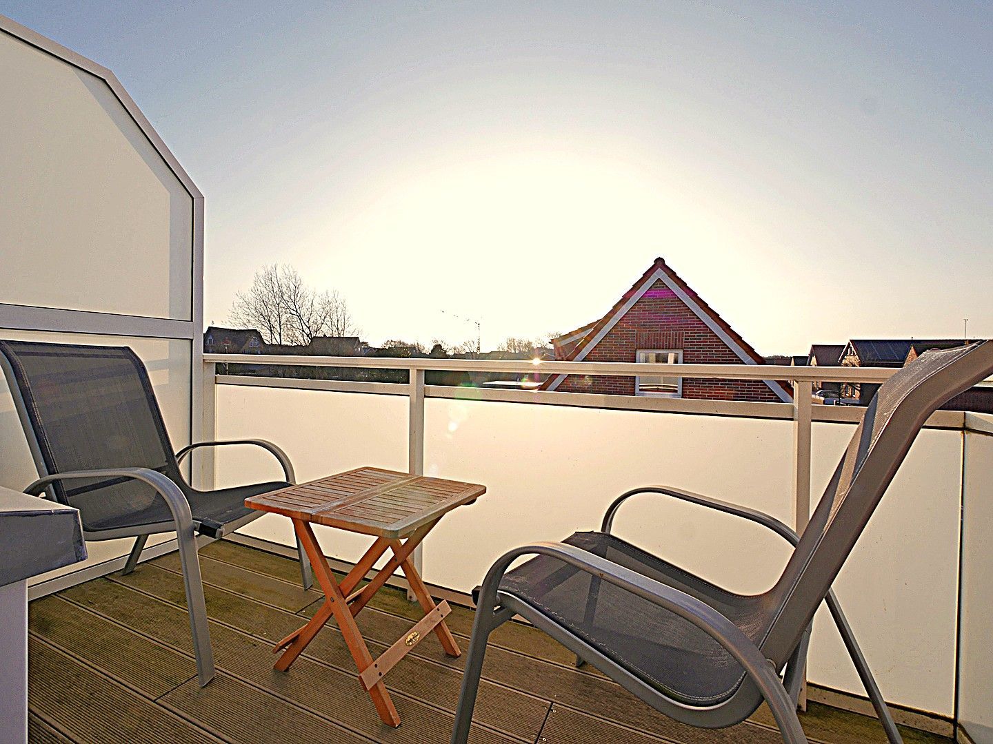 Damit Sie auf Ihrem Balkon gemütlich eine Tasse Tee trinken können, stehen für Sie 2 Balkonstühle und ein Klapptisch zur Verfügung.