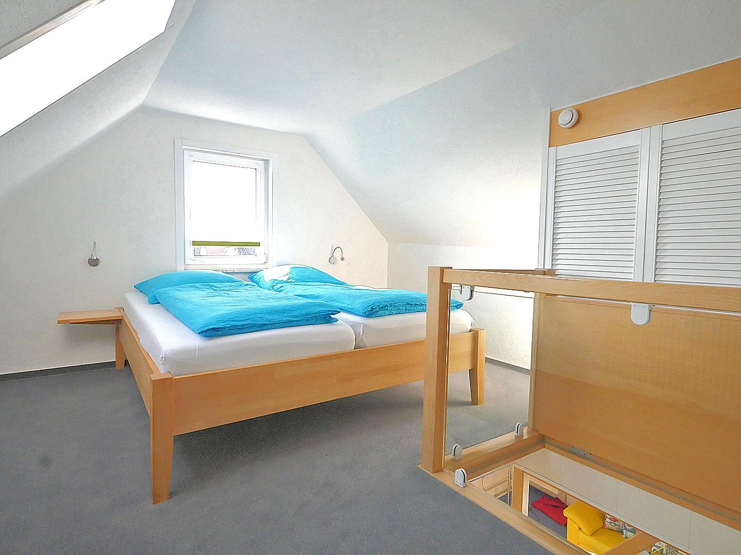 Die obere Etage besteht aus einem separaten Schlafzimmer mit Doppelbett incl. verstellbarem Lattenrost, Kaltschaummatratzen mit Encasings, einem Einbau-Kleiderschrank sowie Ablagefächern. Es kann mit Verdunkelungsplissee und -rollos abgedunkelt werden. Zum gemütlichen Lesen lädt eine Sitzecke mit Schwingsessel ein. Der beleuchtete Treppenaufgang zum Schlafzimmer ist mit einer elektrisch bedienbaren Abdeckung versehen.