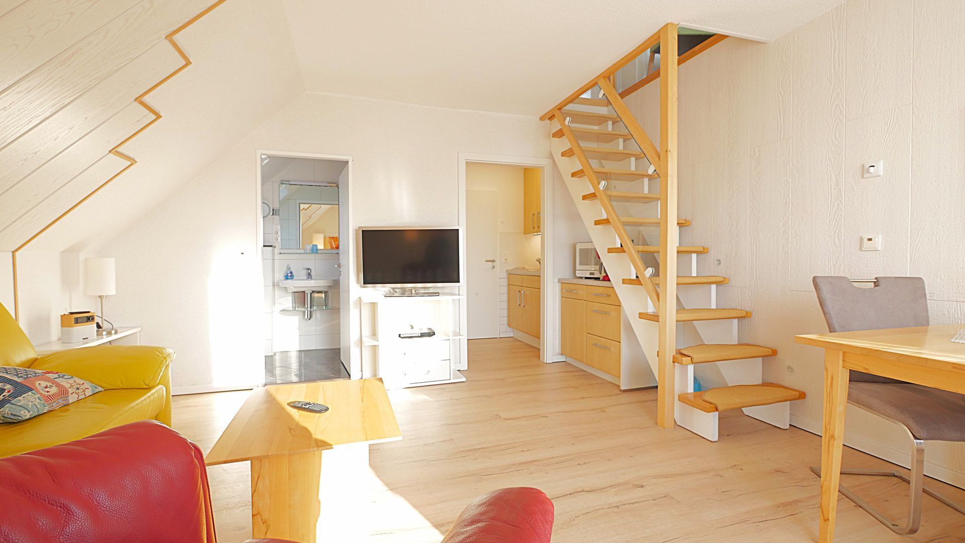 4 Sterne Wohnung. Die lichtdurchflutete Wohnung befindet sich in der 1. Etage und erstreckt sich über 2 Ebenen. Im Eingangsbereich finden Sie eine separate Küchenzeile, den Wohn - / Essbereich mit echtem Kernbuchen-Holztisch und hochwertigen Lederschwingern, den Balkon sowie Dusche / WC. Komfortledersessel und Ledersofa.