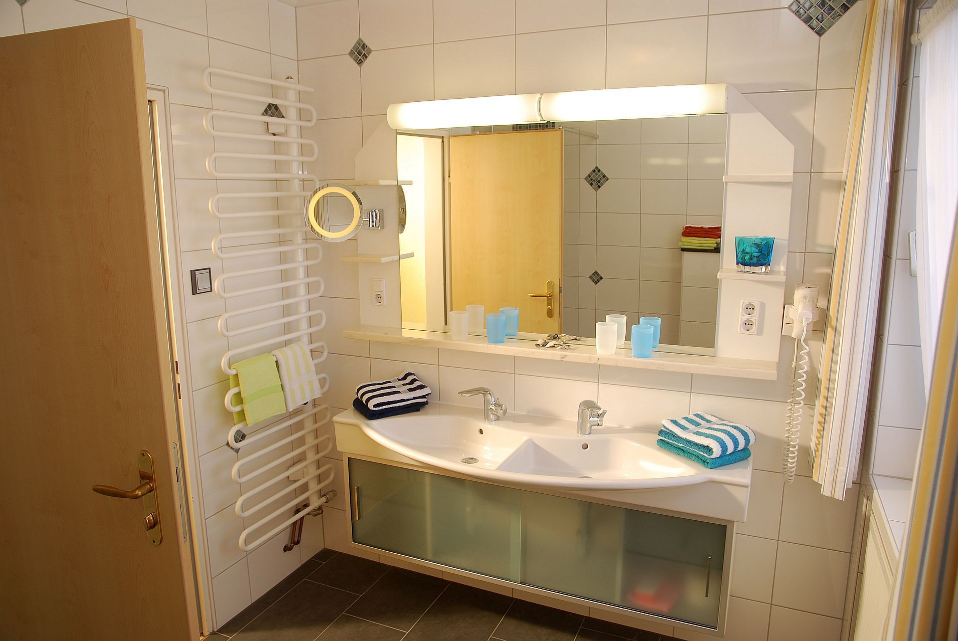 Naturholz-Bodenbelag. Großes Badezimmer mit Doppelwaschbecken und Walk-In Dusche (Länge 1,40 x Breite 1,00 Meter ). Kosmetikspiegel und drehbarer Badestuhl.